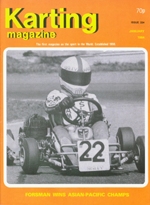 The cover photo was of junior racer Emily Newman. The Asian-Pacific Championships were held in Perth, Australia. The winner of the International Seniors was Sweden's Lars Forsman with Mike Wilson second. Stefano Modena, now a Formula 1 jockey was handicapped by delays in clearing his equipment through customs. Current Grand Prix star, Michael Schumacher, was in the Juniors but the class was initially won by Giovanni Bonano who was then excluded for illegal tyres.